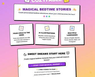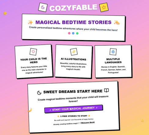 CozyFable is a mobile-friendly web app that helps parents generate unique and heartwarming bedtime stories for their children in seconds. Just enter your child’s name, their favorite animal, and a few personality traits – and CozyFable’s AI will craft a magical 300–600 word story just for them.